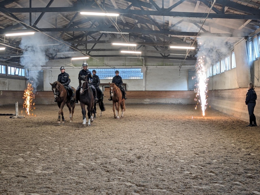 Beeindruckend schließlich auch die Polizeireiterstaffel als dritte Besuchsstadion. Hier präsentierten Polizeireiter mit ihren Pferden einen Ausschnitt aus dem Trainingsprogramm, mit dem die Pferde lernen, im absoluten Vertrauen auf ihren Reiter auch in kritischen Situationen ruhig zu bleiben, statt ihrem Instinkt der Flucht zu folgen. Fahnen, lärmende Rätschen, Feuerwerkskörper, brennende Barrikaden, ja selbst Schüsse aus einem Revolver ließen die Polizeipferde unbeeindruckt und die Besucher staunen.