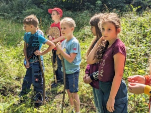 Bei strahlendem Sonnenschein trafen sich 12 ebenso strahlende Kinder in voller Erwartung, was der Nachmittag im Sommerferienprogramm unter dem Titel „Die Geheimnisse des Waldes entdecken“ wohl bringen würde.